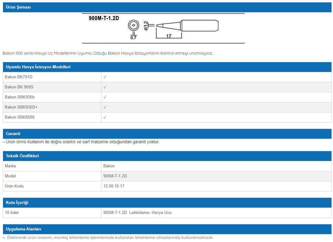 Bakon 900 M-T-1.2D Lehimleme Havya Uçları ile havya uç boyunu kısaltırsanız daha çok, uzatırsanız daha az ısınır ve böylece havyanın çalışma sıcaklığını değiştirebilirsiniz. Paket İçeriği '' 10lu '' olarak satılmaktadır.