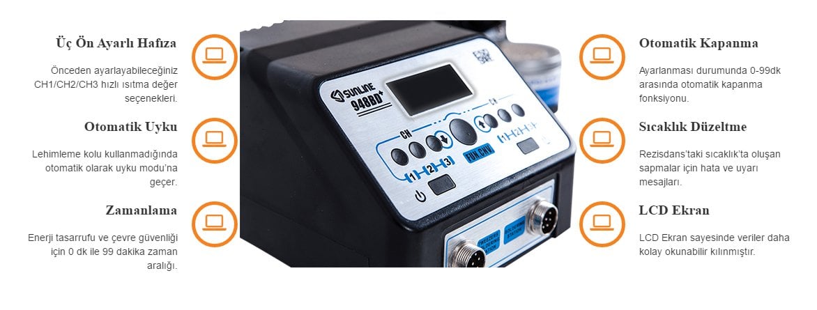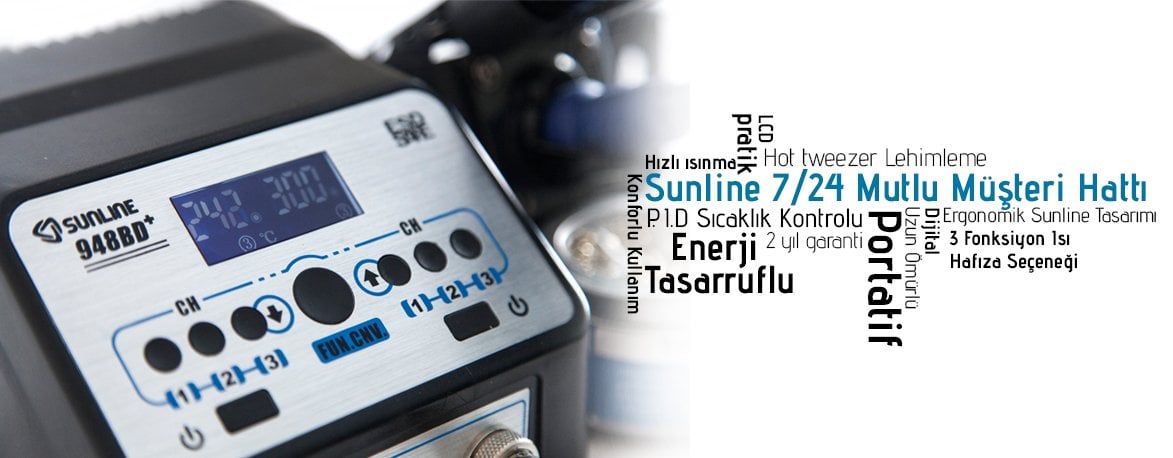 Profesyonellerin işini kolaylaştırmak amacıyla geliştirilen çok fonksiyonlu lehim istasyonu; iki istasyonu bir araya getiriyor. Sunline 948 BD+ serisi, farklı ısı seçenekleri ile farklı lehimleme işlemlerini aynı anda tek makine ile yapabilmeyi sağlayan bir tasarıma sahip. Sınıfının en iyileri arasında yer alan istasyon havya çok fonksiyonlu ve aynı zamanda kolay kullanımlı.